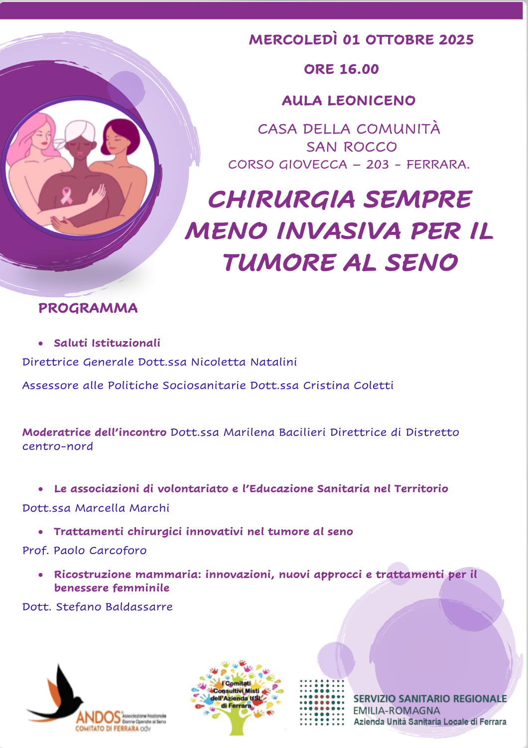 L’Azienda USL di Ferrara ha organizzato, con il coinvolgimento del Comitato ANDOS di Ferrara (Associazione Nazionale Donne Operate al Seno), l’incontro pubblico “Chirurgia sempre meno invasiva per il tumore al seno”, in programma mercoledì 1 ottobre 2025 alle ore 16.00 presso l’Aula Leoniceno della Casa della Comunità San Rocco (Ex Sant’Anna, corso Giovecca 203, Ferrara).